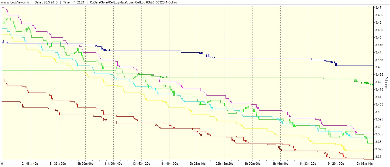Po negativních zkušenostech mnoha lidí s dlouhodobějším používáním Pb akumulátorů ve fotovoltaice jsem zcela jednoznačně zvolil LiFeYPO4 akumulátory s kapacitou 100Ah jednotlivých článku, celkem 16 článků pro 48V systém. Jednotlivé články proto, že je možnost každý samostatně monitorovat. Ke každému článku je připojen balancér a jeden výstup Cell Log 8S, který loguje napětí jednotlivých článků, lze z něj data vyčítat přes USB výstup, alarmovým výstupem např. odpojit celý systém. Články jsou dodávány s napětím 3.3V a před prvním použitím je nutné je nabít na iniciační napětí 4.00V, toto napětí je nutné hlídat (!). Iniciační nabíjení šlo z části dělat z panelů pomocí výkonového DC měniče (svítilo) a laboratorního zdroje ze sítě, dvakrát 6 a jednou 4 články v sérii, při neustálém hlídání koncového napětí 4.00V. Od 3.7V jde už napětí velmi rychle nahoru. Zinicializované články jsem spojil všechny do série, tak jak budou, a připojil pro kontrolu 2x Cell Log 8S, zatížil Etavirou a při odběru 3A vybil na 3.00V na článek, poté komplet sestavil, připojil balancéry a nabil na koncové napětí 3.60V. U nabíjení je na grafech krásně vidět když je proud příliš velký, tak balancéry sice zaberou, ale pouze proud omezí do jejich kapacity, pokud je koncový dobíjecí proud v kapacitě balancérů, tak napětí udrží. Baterie je připravena k zapojení do systému!