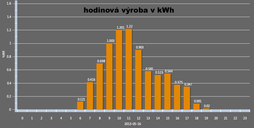Elektrárna je pár dní v provozu a mám k dispozici již něco říkající výsledky výroby elektřiny. Z hodinového grafu výroby vyplývá, že do jedenácté hodiny dopoledne je akumulátor nabíjen naximálním výkonem, poté je nabíjen sníženým proudem, pak už je dodáváno jen do domácnosti a zbylý výkon je ponechán na střeše. V horkém létě bude v provozu klimatizace, která se s přebytkem výkonu hravě vyrovná. Z denního grafu vyplývá pouze to, když je hodně zataženo, tak výroba úměrně tomu poklesne. Údaj o celkové výši výroby energie je nutné chápat jako energii spotřebovanou a zároveň uloženou do akumulátoru, není to energie, kterou je elektrárna schopa vyrobit, ve slunečném dni je celkově možná energie nevyužita.